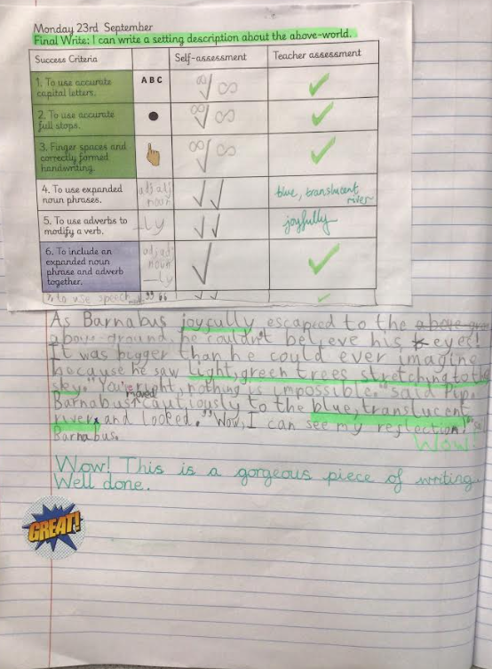 This week, we have waved goodbye to our first topic, 'The Barnabus Project'. The children finished the unit by writing some fantastic descriptions of what Barnabus and his friends see when they escape to the above-ground world. Year three have shown us that they can use rich and powerful vocabulary to describe, as well as interesting adverbs to modify their verbs. Their writing has been nothing short of exciting to read. Please see some examples below...